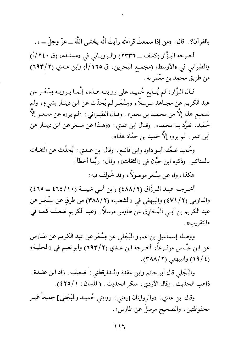 قال البزَّار: لم يُتابع حُميد على روايته هذه، إنَّما يرويه مِسْعَر عن عبد الكريم عن مجاهد مرسلًا، ومِسْعَر لم يُحدّث عن ابن دينار بشيءٍ، ولم نسمع هذا إلَّا من محمد بن معمر". وقال الطبراني: "لم يروه عن مسعر إلَّا حُمَيد، تفرَّد به محمد". وقال ابن عدي: "وهذا عن مسعر عن ابن دينار عن ابن عمر. لم يروه إلَّا حميد بن حمَّاد هذا".