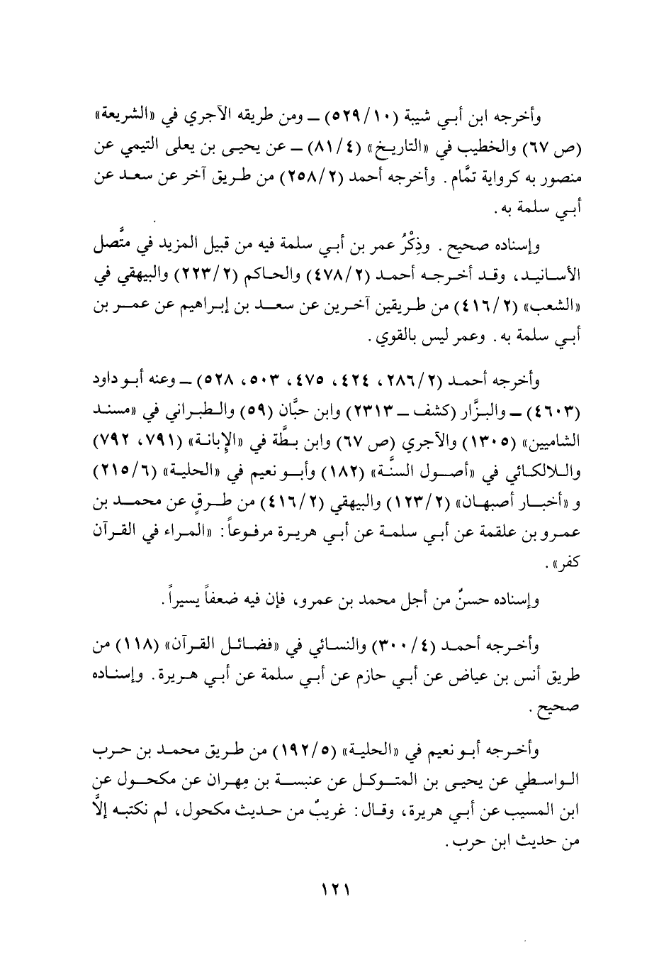وأخرجه أحمد (2/ 286، 424، 475، 503، 528) -وعنه أبو داود (4603) - والبزَّار (كشف - 2313) وابن حبَّان (59) والطبراني في "مسند الشاميين" (1305) والآجري (ص 67) وابن بطَّة في "الإِبانة" (791، 792) واللالكائي في "أصول السنَّة" (182) وأبو نعيم في "الحلية" (6/ 215) و"أخبار أصبهان" (2/ 123) والبيهقي (2/ 416) من طرقٍ عن محمد بن عمرو بن علقمة عن أبي سلمة عن أبي هريرة مرفوعًا: "المراء في القرآن كفر".