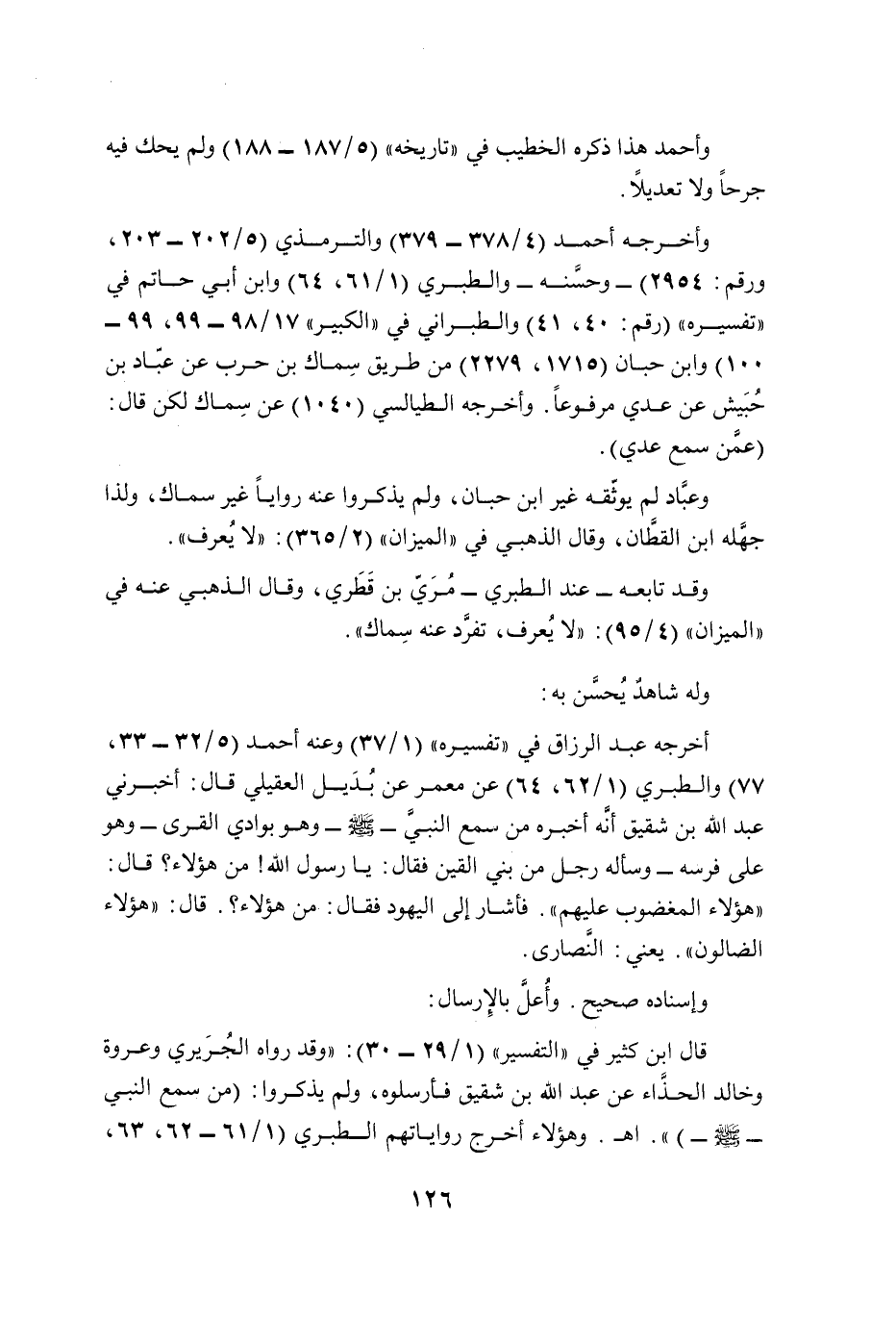 وأخرجه أحمد (4/ 378 - 379) والترمذي (5/ 202 - 203، ورقم: 2954) -وحسَّنه- والطبري (1/ 61، 64) وابن أبي حاتم في "تفسيره" (رقم: 40، 41) والطبراني في "الكبير" 17/ 98 - 99، 99 - 100) وابن حبان (1715، 2279) من طريق سِماك بن حرب عن عبّاد بن حُبَيش عن عدي مرفوعًا. وأخرجه الطيالسي (1040) عن سِماك لكن قال: (عمَّن سمع عدي).