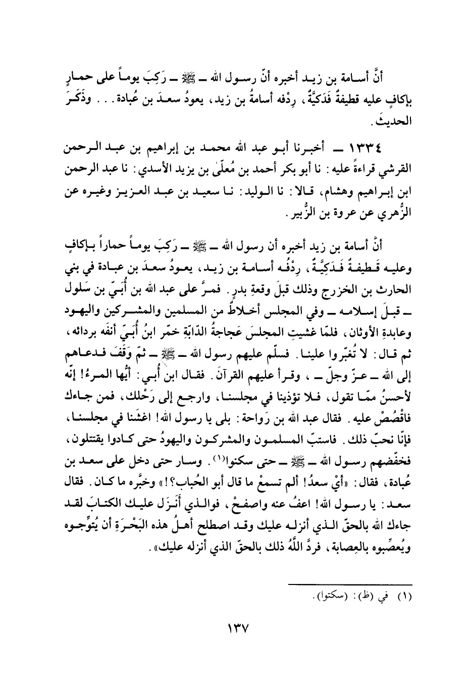 أنَّ أسامة بن زيد أخبره أنّ رسول الله - صلى الله عليه وسلم - رَكِبَ يومًا على حمارٍ بإكافٍ عليه قطيفةٌ فَدَكيَّةٌ، رِدْفه أسامةُ بن زيد، يعودُ سعدَ بن عُبادة ... وذَكَرَ الحديثَ.