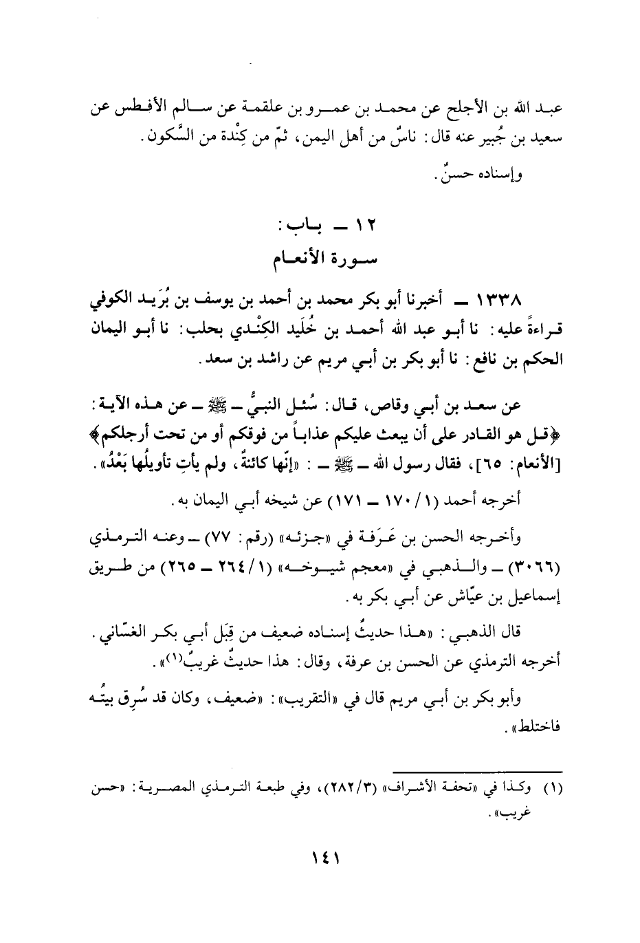 1338 - أخبرنا أبو بكر محمد بن أحمد بن يوسف بن بُرَيد الكوفي قراءةً عليه: نا أبو عبد الله أحمد بن خلَيد الكِنْدي بحلب: نا أبو اليمان الحكم بن نافع: نا أبو بكر بن أبي مريم عن راشد بن سعد.