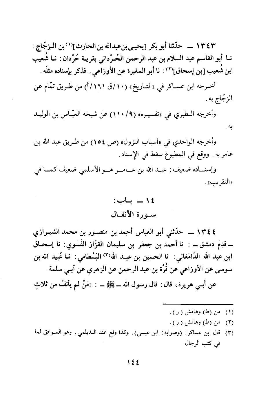 1344 - حدّثني أبو العباس أحمد بن منصور بن محمد الشيرازي -قدِمَ دمشق-: نا أحمد بن جعفر بن سليمان القزّاز الفَسَوي: نا إسحاق ابن عبد الله الدَّامَغاني: نا الحسين بن عبد الله (¬3) البَسْطامي: نا عُبيد الله بن موسى عن الأوزاعي عن قُرَّة بن عبد الرحمن عن الزهري عن أبي سلمة.
