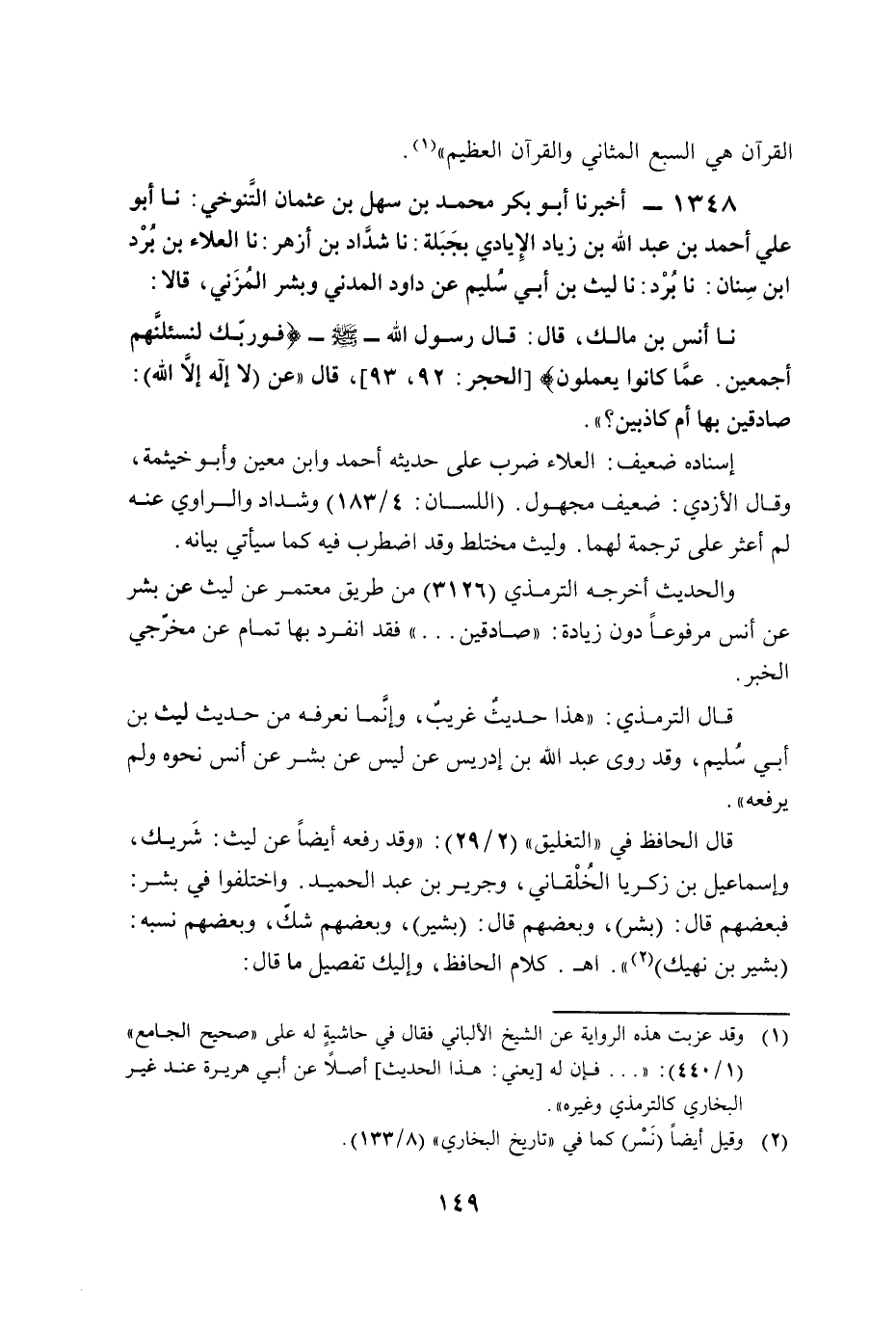 1348 - أخبرنا أبو بكر محمد بن سهل بن عثمان التَّنوخي: نا أبو علي أحمد بن عبد الله بن زياد الإِيادي بجَبَلة: نا شدَّاد بن أزهر: نا العلاء بن بُرْد ابن سِنان: نا بُرْد: نا ليث بن أبي سُليم عن داود المدني وبشر المُزَنى، قالا: