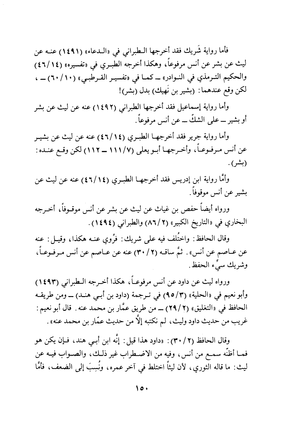 فأما رواية شَريك فقد أخرجها الطبراني في "الدعاء" (1491) عنه عن ليث عن بشر عن أنس مرفوعًا، وهكذا أخرجه الطبري في "تفسيره" (14/ 46) والحكيم الترمذي في النوادر" -كما في "تفسير القرطبي" (10/ 60) -، لكن وقع عندهما: (بشير بن نَهيك) بدل (بشر)!