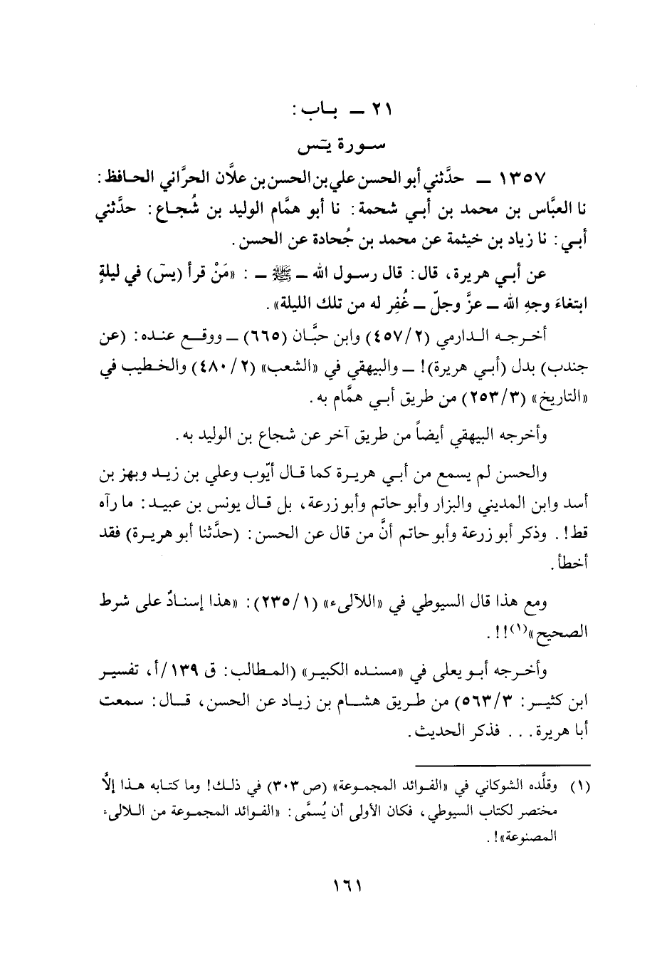1357 - حدَّثني أبو الحسن علي بن الحسن بن علاَّن الحرَّاني الحافظ: نا العبَّاس بن محمد بن أبي شحمة: نا أبو همَّام الوليد بن شُجاع: حدَّثني أبي: نا زياد بن خيثمة عن محمد بن جُحادة عن الحسن.