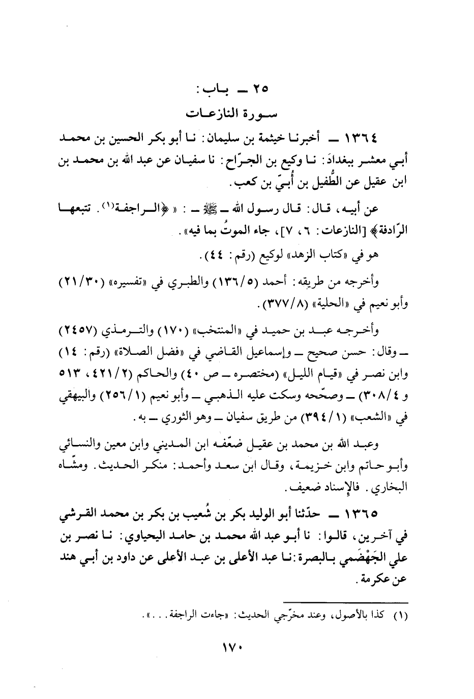 1364 - أخبرنا خيثمة بن سليمان: نا أبو بكر الحسين بن محمد أبي معشر ببغدادَ: نا وكيع بن الجرّاح: نا سفيان عن عبد الله بن محمد بن ابن عقيل عن الطُّفيل بن أُبيّ بن كعب.