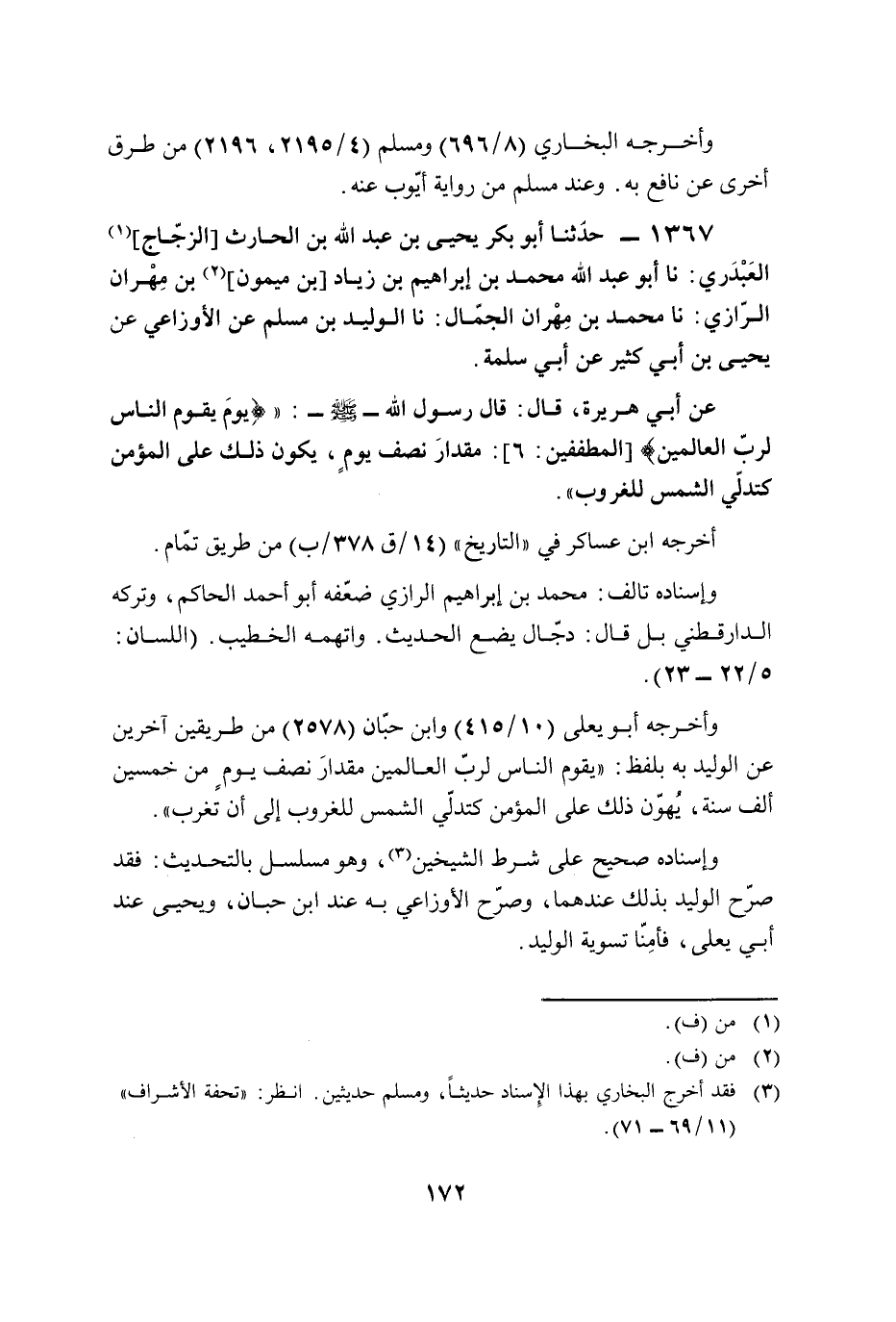 1367 - حدّثنا أبو بكر يحيى بن عبد الله بن الحارث [الزجّاج] (¬1) العَبْدَري: نا أبو عبد الله محمد بن إبراهيم بن زياد [بن ميمون] (¬2) بن مِهْران الرّازي: نا محمد بن مِهْران الجمّال: نا الوليد بن مسلم عن الأوزاعي عن يحيى بن أبي كثير عن أبي سلمة.