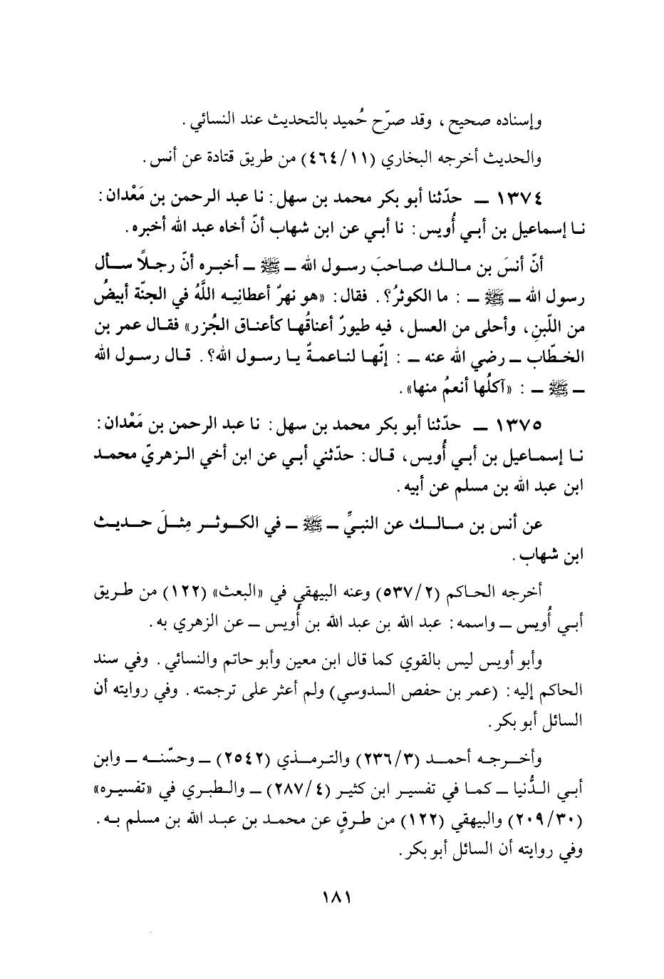 عن أنس بن مالك عن النبيِّ - صلى الله عليه وسلم - في الكوثر مِثلَ حديث ابن شهاب.