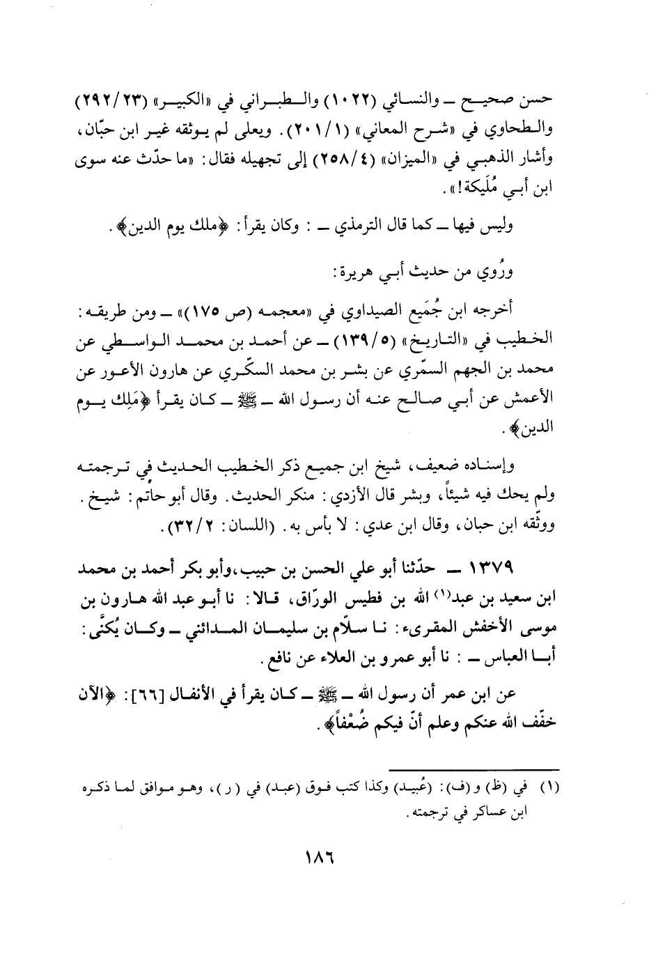 1379 - حدّثنا أبو علي الحسن بن حبيب، وأبو بكر أحمد بن محمد ابن سعيد بن عبد (¬1) الله بن فطيس الورّاق، قالا: نا أبو عبد الله هارون بن موسى الأخفش المقرىء: نا سلّام بن سليمان المدائني -وكان يُكنَّى: أبا العباس-: نا أبو عمرو بن العلاء عن نافع.
