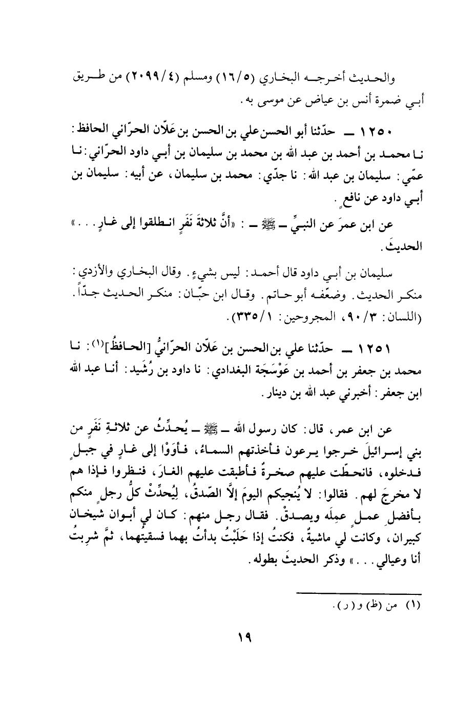 1250 - حدّثنا أبو الحسن علي بن الحسن بن عَلاّن الحرّاني الحافظ: نا محمد بن أحمد بن عبد الله بن محمَّد بن سليمان بن أبي داود الحرّاني: نا عمّي: سليمان بن عبد الله: نا جدّي: محمَّد بن سليمان، عن أبيه: سليمان بن أبي داود عن نافعٍ.