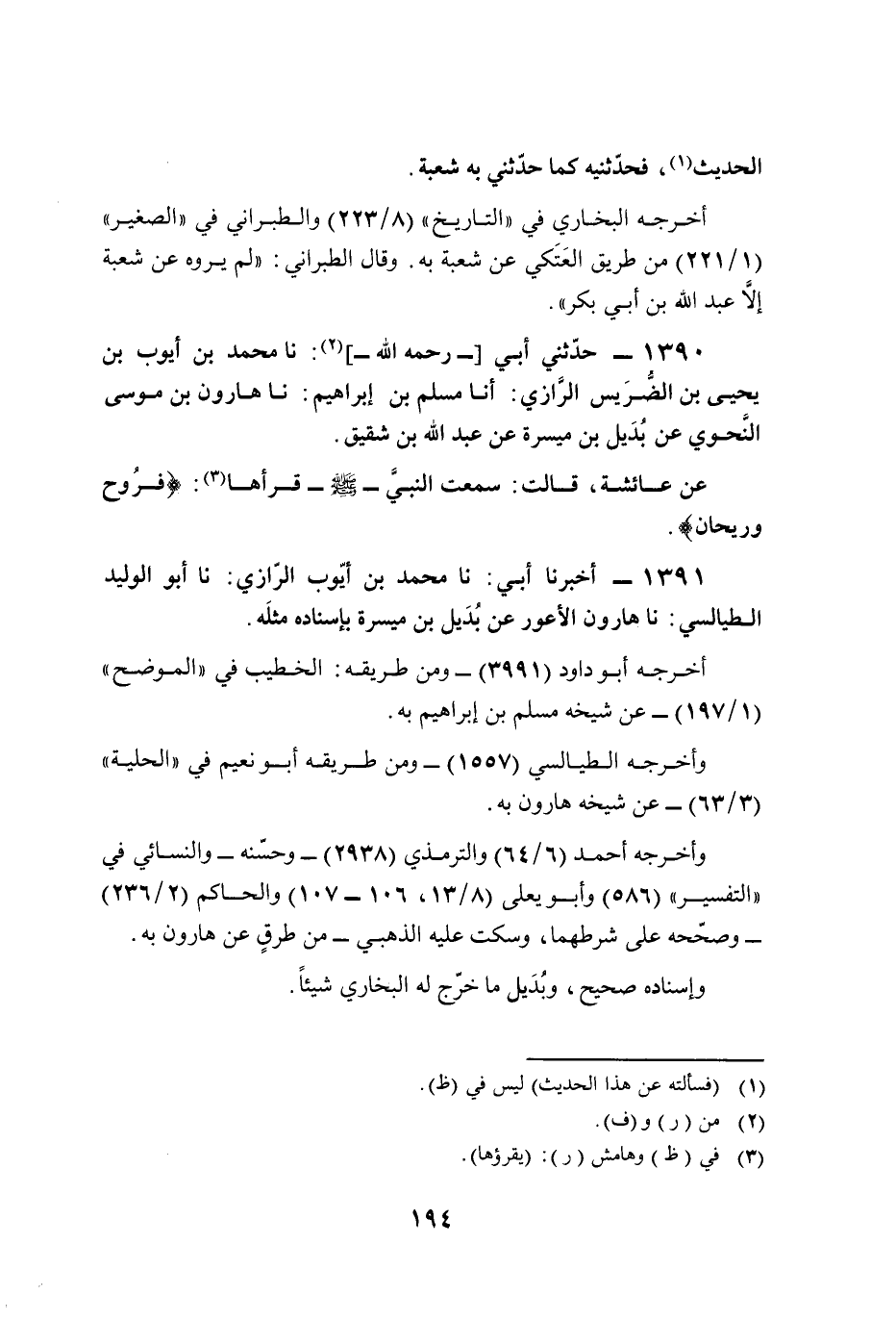 1390 - حدّثني أبي [-رحمه الله-] (¬2): نا محمد بن أيوب بن يحيى بن الضُّرَيس الرَّازي: أنا مسلم بن إبراهيم: نا هارون بن موسى النَّحوي عن بُدَيل بن ميسرة عن عبد الله بن شقيق.