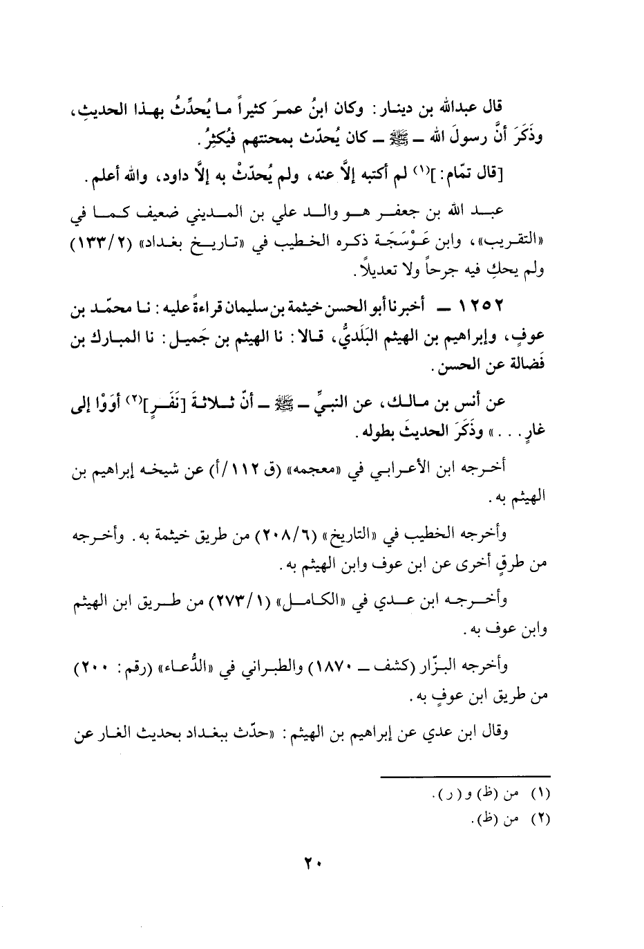 1252 - أخبرنا أبو الحسن خيثمة بن سليمان قراءةً عليه: نا محمّد بن عوفٍ، وإبراهيم بن الهيثم البَلَديُّ، قالا: نا الهيثم بن جَميل: نا المبارك بن فَضالة عن الحسن.