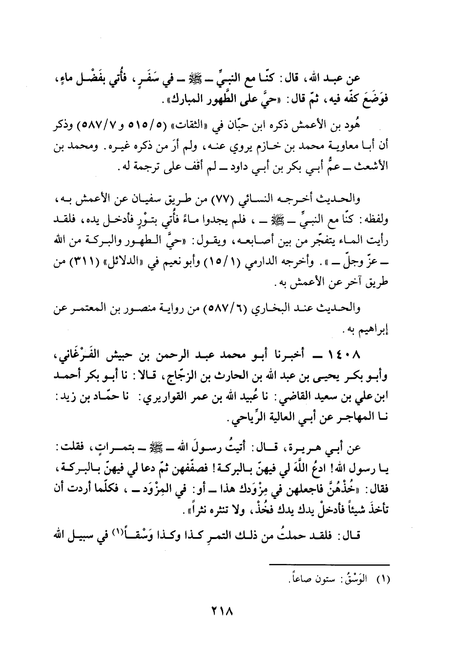 عن عبد الله، قال: كنّا مع النبيِّ - صلى الله عليه وسلم - في سَفَرٍ، فأُتي بفَضْل ماءٍ، فوَضَعَ كفّه فيه، ثمّ قال: "حيَّ على الطَّهور المبارك".