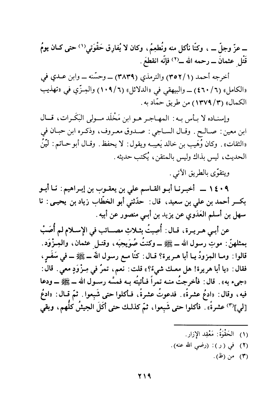 عن أبي هريرة، قال: أُصِبتُ بثلاثِ مصائب في الإِسلام لم أُصَبْ بمثلهنّ: موتِ رسول الله - صلى الله عليه وسلم - وكنتُ صُوَيحِبَه، وقتلِ عثمان، والمِزوَد. قالوا: وما المِزودُ يا أبا هريرة؟ قال: كنّا مع رسول الله - صلى الله عليه وسلم - في سَفرٍ، فقال: "يا أبا هريرة! هل معك شيءٌ؟ " قلت: نعم، تمرٌ في مِزْوَدٍ معي. قال: "جىء به". قال: فأخرجِتُ منه تمرًا فأتيتُه به فمسَّه رسول الله - صلى الله عليه وسلم - ودعا فيه، وقال: "ادعُ عشرةً". فدعوتُ عشرةً، فأكلوا حتى شَبِعوا. ثمّ قال: "ادعُ [لي] (¬3) عشرةً". فأكلوا حتى شَبِعوا، ثمّ كذلك حتى أكَلَ الجيشُ كلُّهم، وبقي