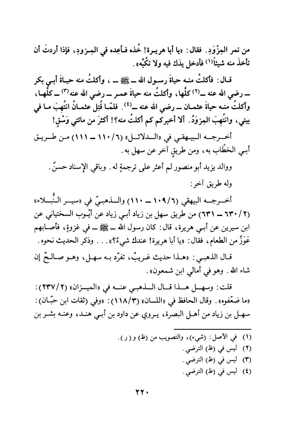 أخرجه البيهقي (6/ 109 - 110) والذهبيّ في "سير النُّبلاء" (2/ 630 - 631) من طريق سهل بن زياد أبي زياد عن أيّوب السختياني عن ابن سيرين عن أبي هريرة، قال: كان رسول الله - صلى الله عليه وسلم - في غزوةٍ، فأصابهم عَوَزٌ من الطعام، فقال: "يا أبا هريرة! عندك شيءٌ؟ " ... وذكر الحديث نحوه.
