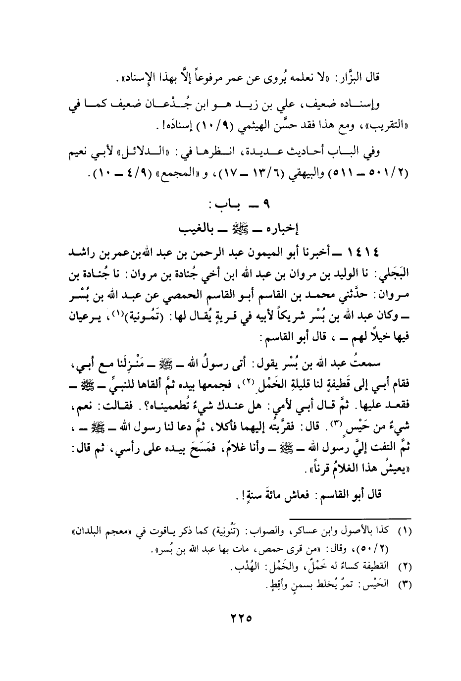 سمعتُ عبد الله بن بُسْر يقول: أتى رسولُ الله - صلى الله عليه وسلم - مَنْزِلَنا مع أبي، فقام أبي إلى قَطيفةٍ لنا قليلةِ الخَمْلِ (¬2)، فجمعها بيده ثمَّ ألقاها للنبيِّ - صلى الله عليه وسلم - فقعد عليها. ثمَّ قال أبي لأمي: هل عندك شيءٌ تُطعميناه؟. فقالت: نعم، شيءٌ من حَيْسٍ (¬3). قال: فقرَّبتُه إليهما فأكلا، ثمَّ دعا لنا رسول الله - صلى الله عليه وسلم -، ثمَّ التفت إليَّ رسول الله - صلى الله عليه وسلم - وأنا غلامٌ، فمَسَحَ بيده على رأسي، ثم قال: "يعيشُ هذا الغلامُ قرنًا".