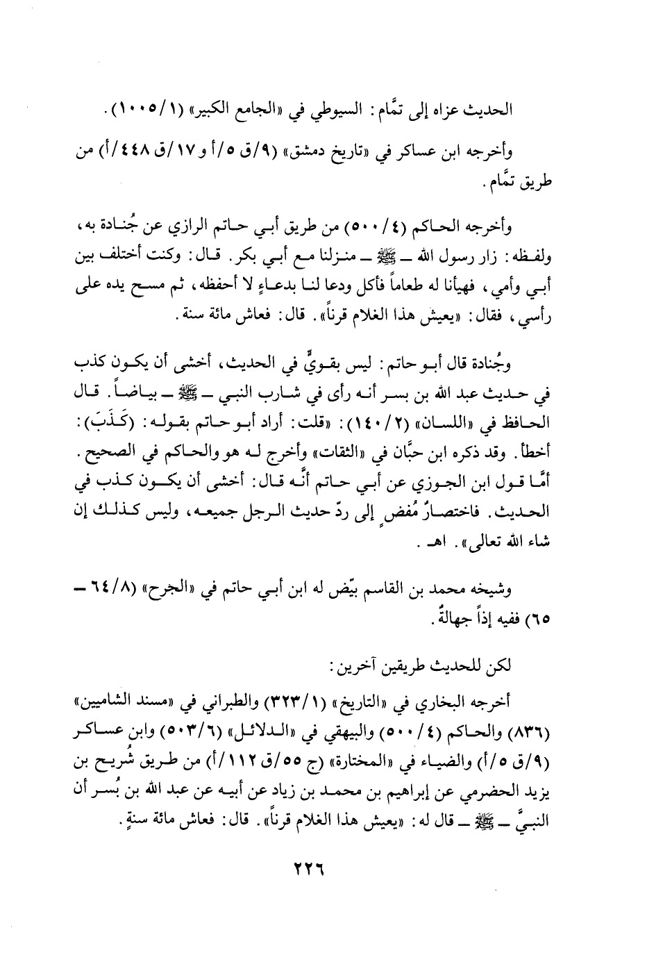 أخرجه البخاري في "التاريخ" (1/ 323) والطبراني في "مسند الشاميين" (836) والحاكم (4/ 500) والبيهقي في "الدلائل" (6/ 503) وابن عساكر (9/ ق 5/ أ) والضياء في "المختارة" (ج 55/ ق 112/ أ) من طريق شُريح بن يزيد الحضرمي عن إبراهيم بن محمد بن زياد عن أبيه عن عبد الله بن بُسر أن النبيَّ - صلى الله عليه وسلم - قال له: "يعيش هذا الغلام قرنًا". قال: فعاش مائة سنةٍ.