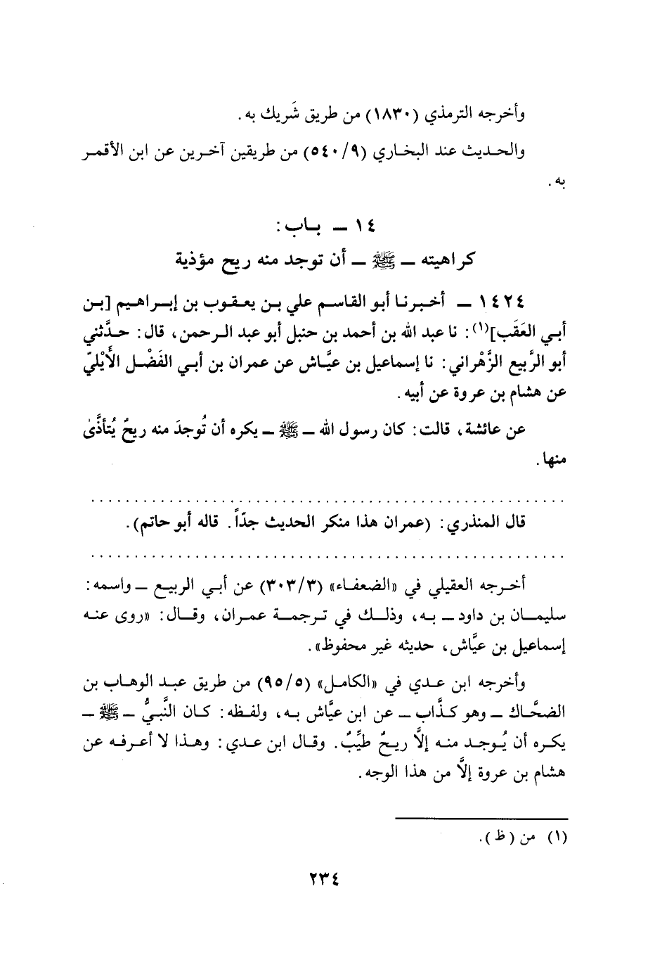 وأخرجه ابن عدي في "الكامل" (5/ 95) من طريق عبد الوهاب بن الضحَّاك -وهو كذَّاب- عن ابن عيَّاش به، ولفظه: كان النَّبيُّ - صلى الله عليه وسلم - يكره أن يُوجد منه إلَّا ريحٌ طيِّبٌ. وقال ابن عدي: وهذا لا أعرفه عن هشام بن عروة إلَّا من هذا الوجه.