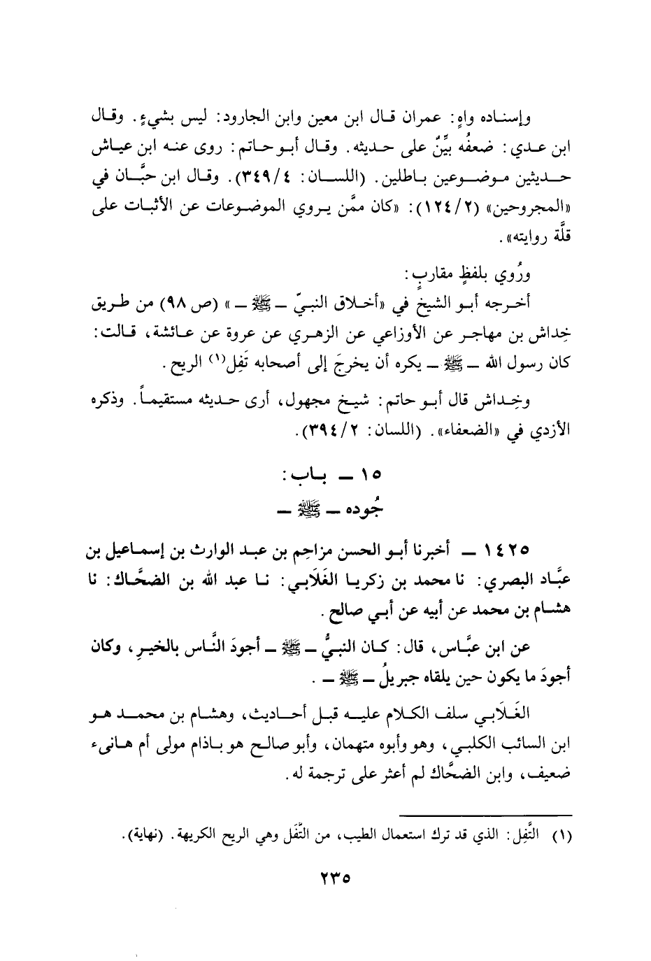 1425 - أخبرنا أبو الحسن مزاحِم بن عبد الوارث بن إسماعيل بن عبَّاد البصري: نا محمد بن زكريا الغَلاَبي: نا عبد الله بن الضحَّاك: نا هشام بن محمد عن أبيه عن أبي صالح.