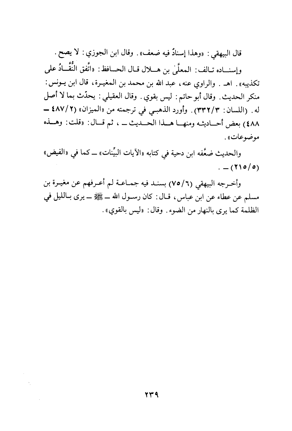وأخرجه البيهقي (6/ 75) بسند فيه جماعة لم أعرفهم عن مغيرة بن مسلم عن عطاء عن ابن عباس، قال: كان رسول الله - صلى الله عليه وسلم - يرى بالليل في الظلمة كما يرى بالنهار من الضوء. وقال: "ليس بالقوي".
