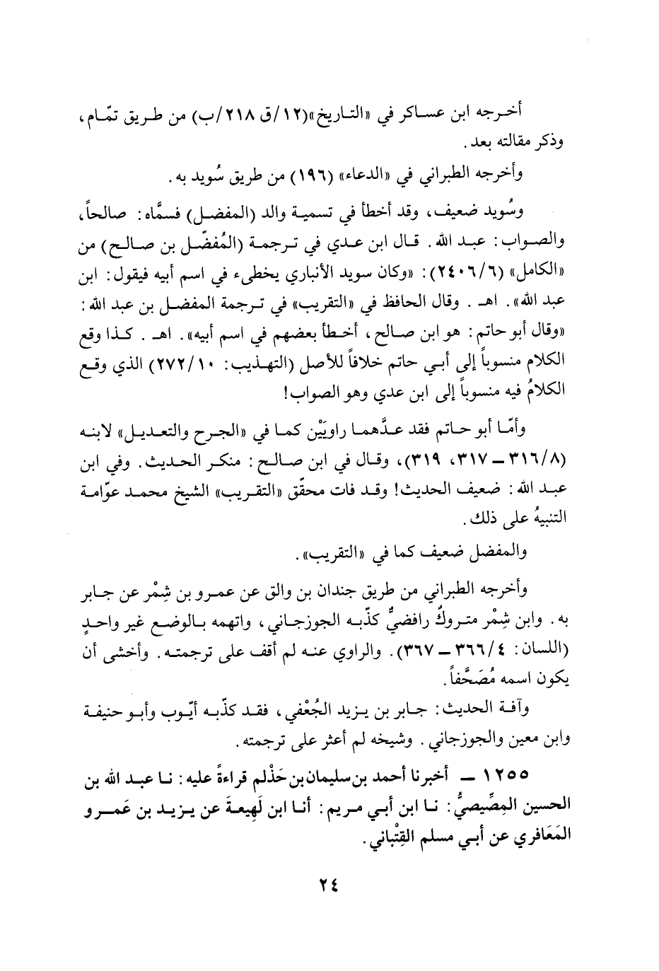وسُويد ضعيف، وقد أخطأ في تسمية والد (المفضل) فسمَّاه: صالحًا، والصواب: عبد الله. قال ابن عدي في ترجمة (المُفضّل بن صالح) من "الكامل" (6/ 2406): "وكان سويد الأنباري يخطئ في اسم أبيه فيقول: ابن عبد الله". أهـ. وقال الحافظ في "التقريب" في ترجمة المفضل بن عبد الله: "وقال أبو حاتم: هو ابن صالح، أخطأ بعضهم في اسم أبيه". أهـ. كذا وقع الكلام منسوبًا إلى أبي حاتم خلافًا للأصل (التهذيب: 10/ 272) الذي وقع الكلامُ فيه منسوبًا إلى ابن عدي وهو الصواب!
