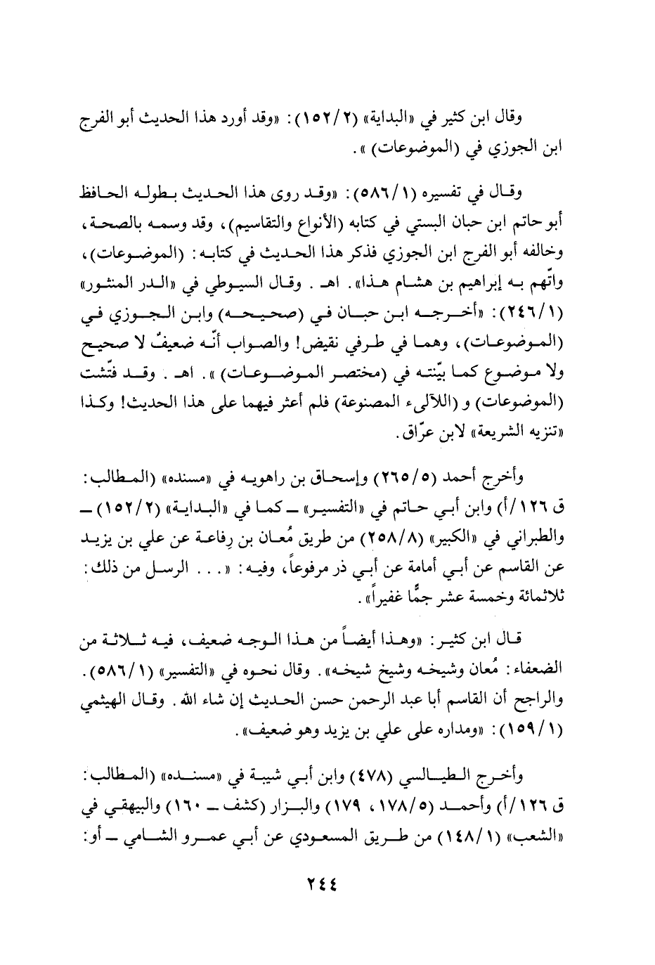 وقال في تفسيره (1/ 586): "وقد روى هذا الحديث بطوله الحافظ أبو حاتم ابن حبان البستي في كتابه (الأنواع والتقاسيم)، وقد وسمه بالصحة، وخالفه أبو الفرج ابن الجوزي فذكر هذا الحديث في كتابه: (الموضوعات)، واتّهم به إبراهيم بن هشام هذا". أهـ. وقال السيوطي في "الدر المنثور" (1/ 246): "أخرجه ابن حبان في (صحيحه) وابن الجوزي في (الموضوعات)، وهما في طرفي نقيض! والصواب أنّه ضعيفٌ لا صحيح ولا موضوع كما بيّنته في (مختصر الموضوعات) ". أهـ. وقد فتّشت (الموضوعات) و (اللآلئ المصنوعة) فلم أعثر فيهما على هذا الحديث! وكذا "تنزيه الشريعة" لابن عرّاف.