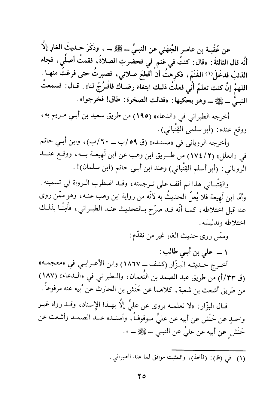 قال البزّار: "لا نعلمه يروى عن عليٍّ إلَّا بهذا الإِسناد، وقد رواه غير واحدٍ عن حَنَش عن أبيه عن عليٍّ موقوفًا، وأسنده عبد الصمد وأشعث عن حَنَشٍ عن أبيه عن عليٍّ عن النبي - صلى الله عليه وسلم -".