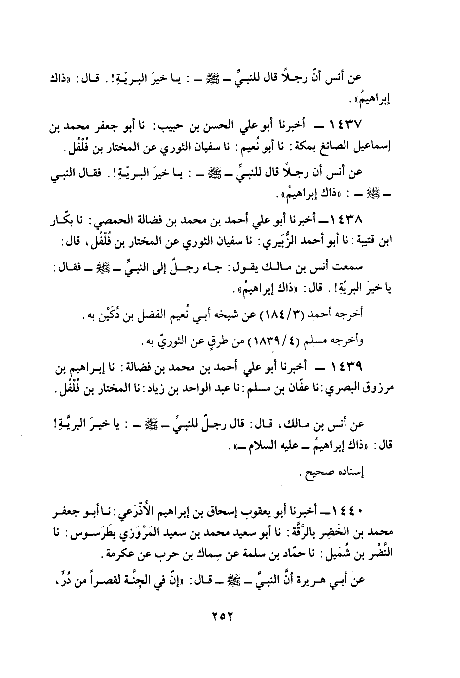 سمعت أنس بن مالك يقول: جاء رجلٌ إلى النبيِّ - صلى الله عليه وسلم - فقال: يا خيرَ البريّةِ!. قال: "ذاك إبراهيمُ".