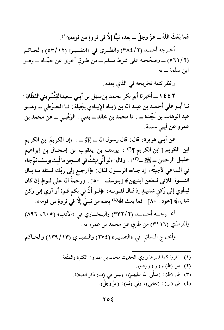 عن أبي هريرة، قال: قال رسول الله - صلى الله عليه وسلم -: "إن الكريمَ ابن الكريم ابن الكريم [ابن الكريم] (¬2): يوسف بن يعقوب بن إسحاق بن إبراهيم خليل الرحمن - صلى الله عليه وسلم - (¬3) ". وقال: "لو أنِّي لبثتُ في السجن ما لَبِث يوسف ثمّ جاء في الداعي لأجبتُه، إذ جاءه الرسول فقال: {ارْجِعْ إِلَى رَبِّكَ فَاسْأَلْهُ مَا بَالُ النِّسْوَةِ اللَّاتِي قَطَّعْنَ أَيْدِيَهُنَّ} [يوسف: 50]. ورحمةُ الله على لوطٍ إن كان ليأوي إلى رُكنٍ شديدٍ إذ قال لقومه: {لَوْ أَنَّ لِي بِكُمْ قُوَّةً أَوْ آوِي إِلَى رُكْنٍ شَدِيدٍ} [هود: 80]. فما بعث الله (¬4) بعده من نبيٍّ إلَّا في ثروةٍ من قومه".