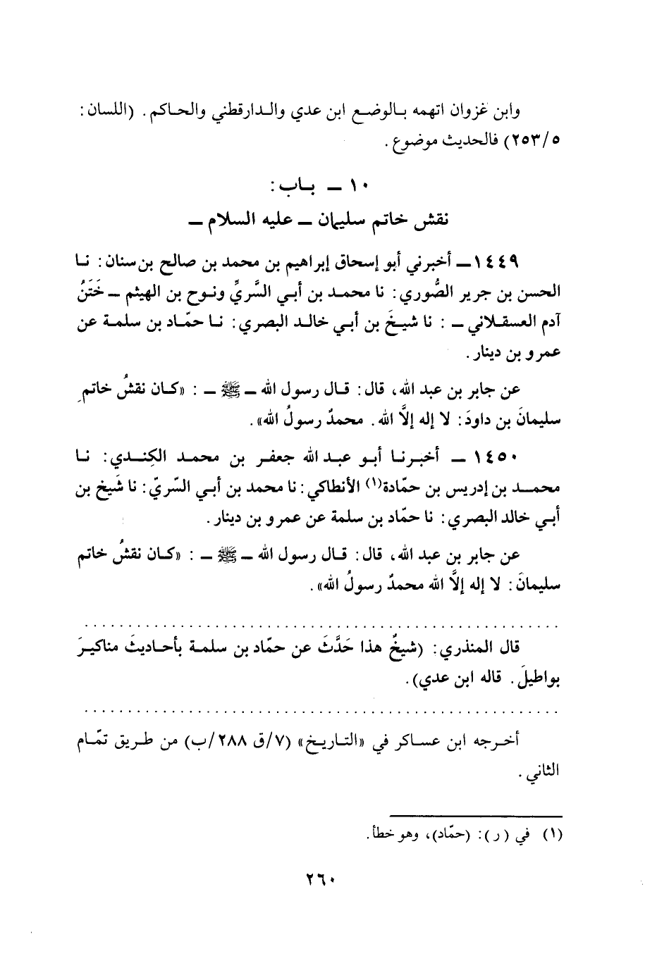 1449 - أخبرني أبو إسحاق إبراهيم بن محمد بن صالح بن سنان: نا الحسن بن جرير الصُّوري: نا محمد بن أبي السَّريِّ ونوح بن الهيثم -خَتَنُ آدم العسقلاني-: نا شيخَ بن أبي خالد البصري: نا حمّاد بن سلمة عن عمرو بن دينار.