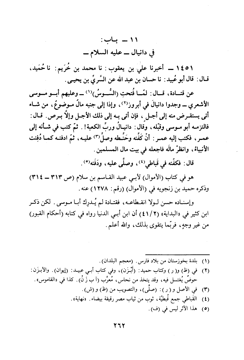 عن قتادة، قال: لمّا فُتحتِ (السُّوسُ) (¬1) -وعليهم أبو موسى الأشعري- وجدوا دانيالَ في أبروز (¬2)، وإذا إلى جنبه مالٌ موضوعٌ، من شاء أتى يستقرض منه إلى أجلٍ، فإن أتى به إلى ذلك الأجل وإلَّا برص. قال: فالتزمه أبو موسى وقبّله، وقال: دانيالُ وربِّ الكعبة!. ثمّ كتب في شأنه إلى عمر، فكتب إليه عمر: أنْ كَفِّنه وحَنِّطه وصلِّ (¬3) عليه، ثمّ ادفنه كلما دُفِنت الأنبياءُ، وانظرْ مالَه فاجعله في بيت مال المسلمين.