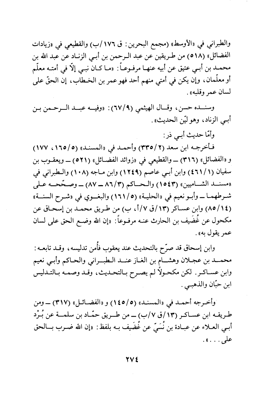 والطبراني في "الأوسط" (مجمع البحرين: ق 176/ ب) والقطيعي في "زيادات الفضائل" (518) من طريقين عن عبد الرحمن بن أبي الزناد عن عبد الله بن محمد بن أبي عتيق عن أبيه عنها مرفوعًا: "ما كان نبي إلَّا في أمته معلّم أو معلّمان، وإن يكن في أمتي منهم أحد فهو عمر بن الخطاب، إن الحقّ على لسان عمر وقلبه".