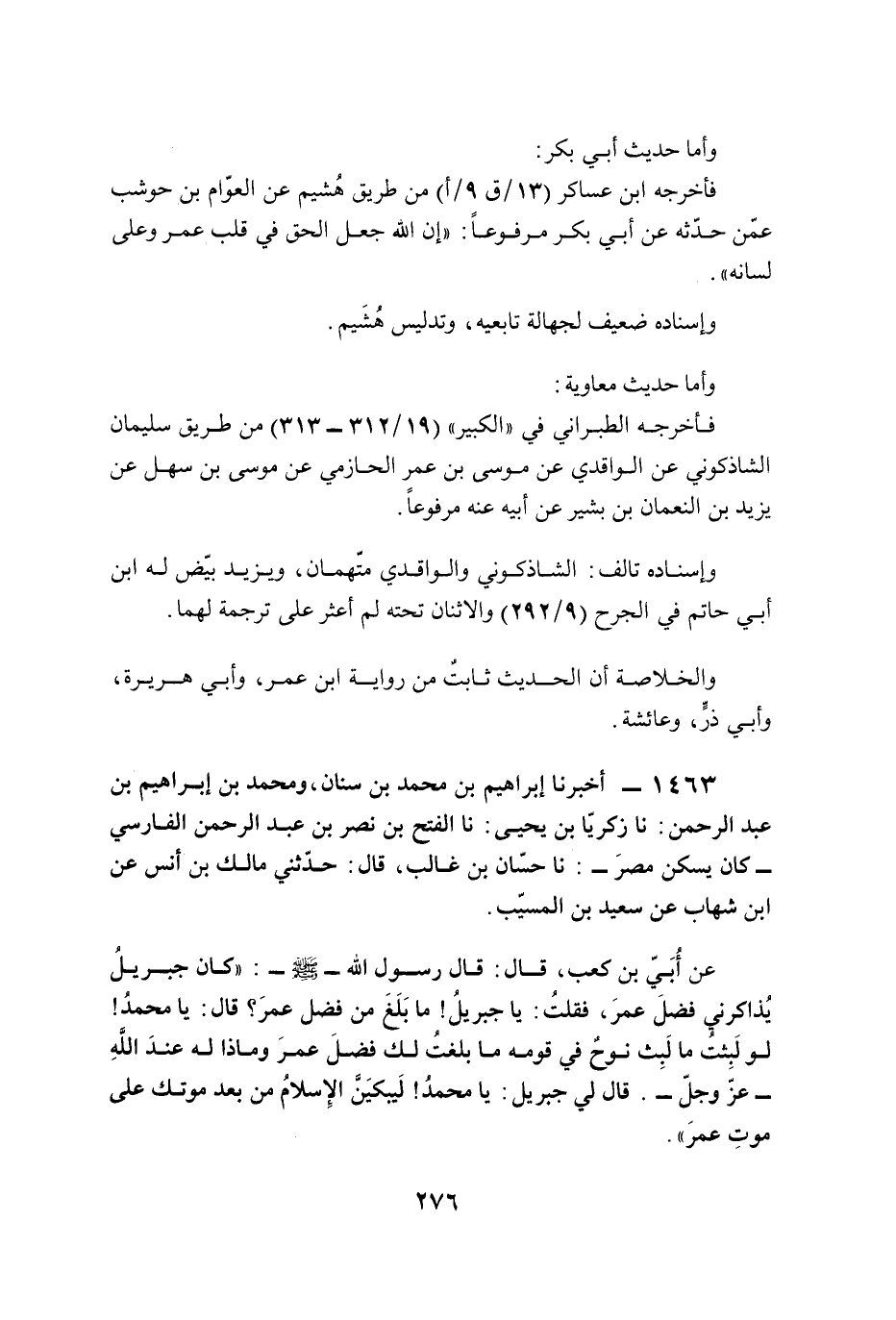 عن أُبَيّ بن كعب، قال: قال رسول الله - صلى الله عليه وسلم -: "كان جبريلُ يُذاكرني فضلَ عمرَ، فقلتُ: يا جبريلُ! ما بَلَغَ من فضل عمرَ؟ قال: يا محمدُ! لو لَبِثتُ ما لَبِث نوحٌ في قومه ما بلغتُ لك فضلَ عمرَ وماذا له عندَ اللهِ -عَزَّ وَجَلَّ-. قال لي جبريل: يا محمدُ! لَيبكيَنَّ الإِسلامُ من بعد موتك على موتِ عمرَ".