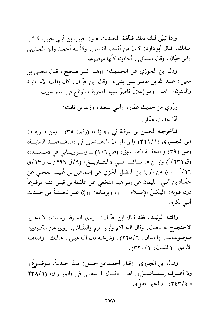 وإذا تبيّن لك ذلك فآفة الحديث هو: حبيب بن أبي حبيب كاتب مالك، قال أبو داود: كان من أكذب الناس. وكذّبه أحمد وابن المديني وابن حبّان، وقال النسائي: أحاديثه كلّها موضوعة.