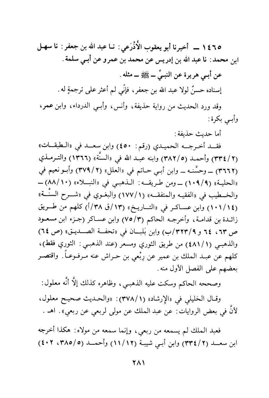 1465 - أخبرنا أبو يعقوب الأذْرَعي: نا عبد الله بن جعفر: نا سهل ابن محمد: نا عبد الله بن إدريس عن محمد بن عمرو عن أبي سلمة.
