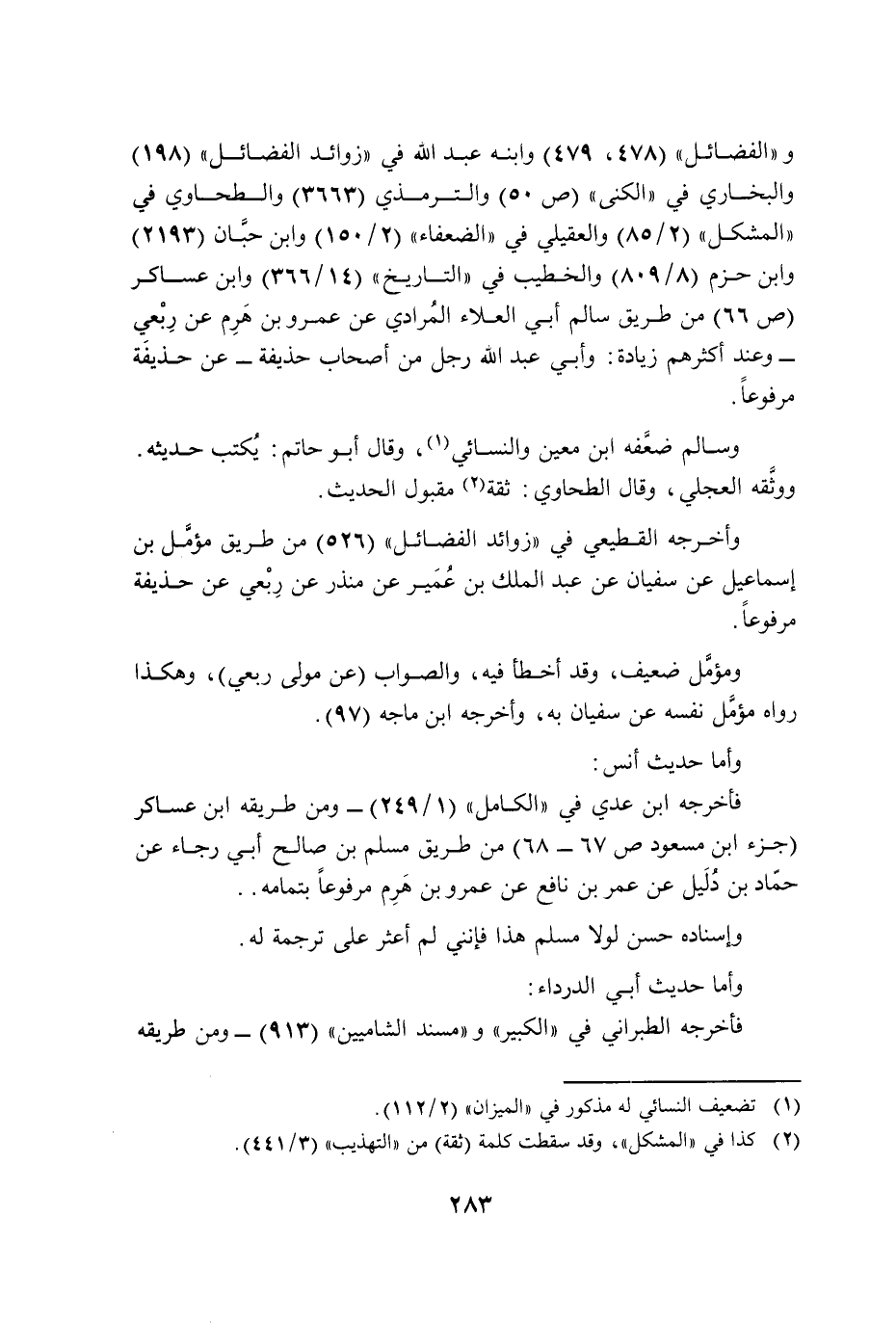 و"الفضائل" (478، 479) وابنه عبد الله في "زوائد الفضائل" (198) والبخاري في "الكنى" (ص 50) والترمذي (3663) والطحاوي في "المشكل" (2/ 85) والعقيلي في "الضعفاء" (2/ 150) وابن حبَّان (2193) وابن حزم (8/ 809) والخطيب في "التاريخ" (14/ 366) وابن عساكر (ص 66) من طريق سالم أبي العلاء المُرادي عن عمرو بن هَرِم عن رِبْعي -وعند أكثرهم زيادة: وأبي عبد الله رجل من أصحاب حذيفة- عن حذيفة مرفوعًا.