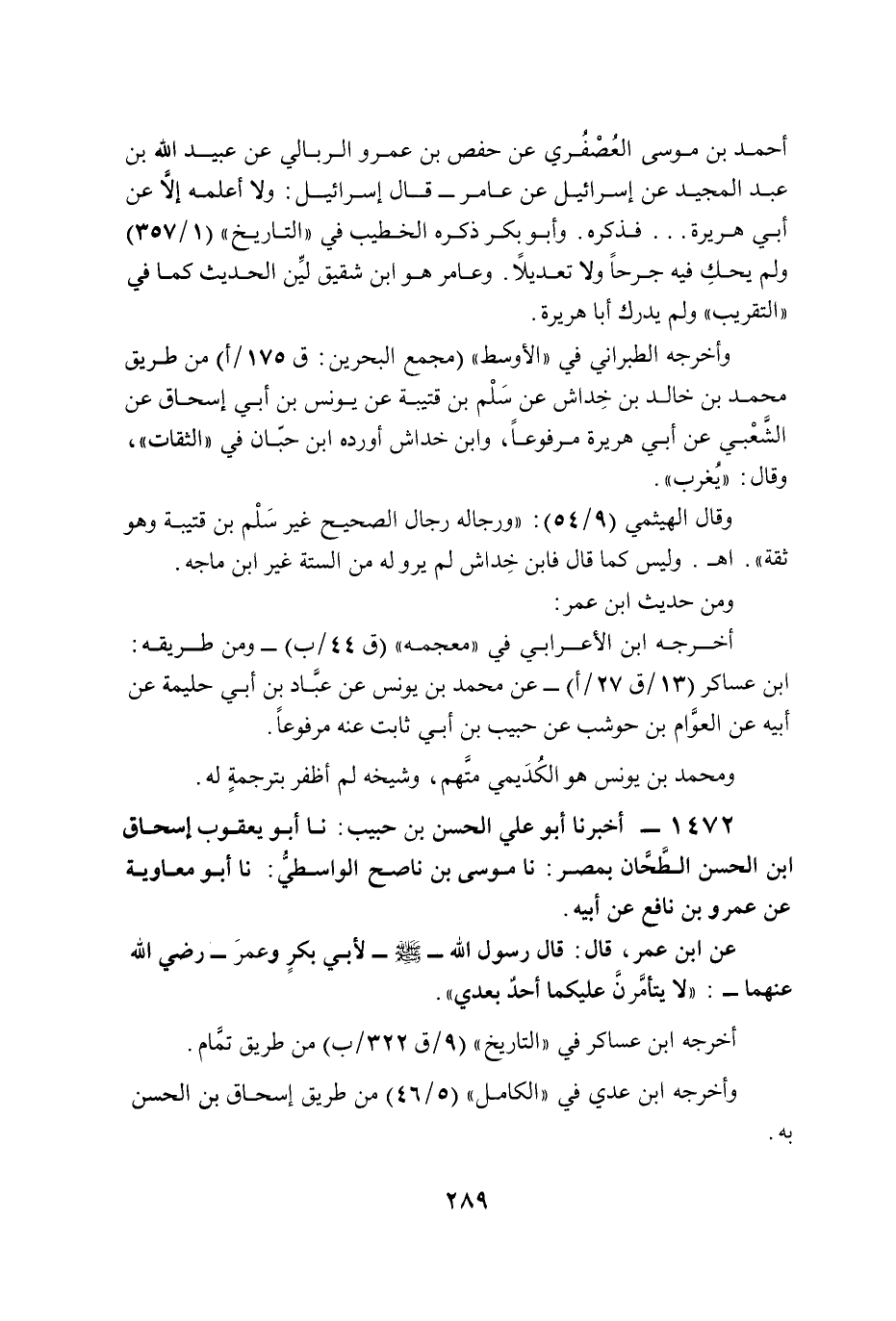 1472 - أخبرنا أبو علي الحسن بن حبيب: نا أبو يعقوب إسحاق ابن الحسن الطَّحَّان بمصر: نا موسى بن ناصح الواسطيُّ: نا أبو معاوية عن عمرو بن نافع عن أبيه.