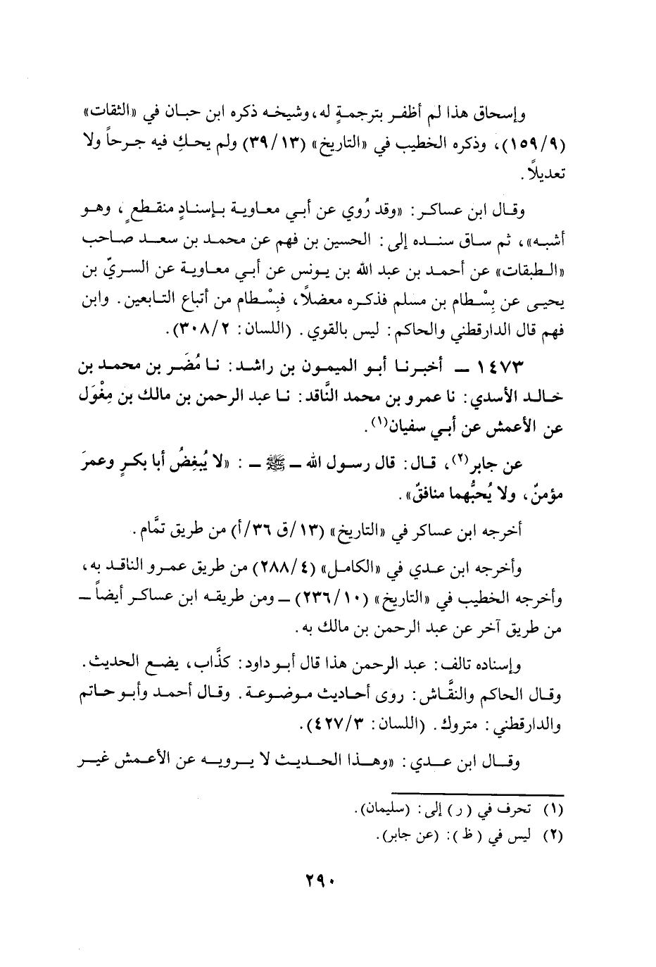 1473 - أخبرنا أبو الميمون بن راشد: نا مُضَر بن محمَّد بن خالد الأسدي: نا عمرو بن محمَّد النَّاقد: نا عبد الرحمن بن مالك بن مِغْوَل عن الأعمش عن أبي سفيان (¬1).