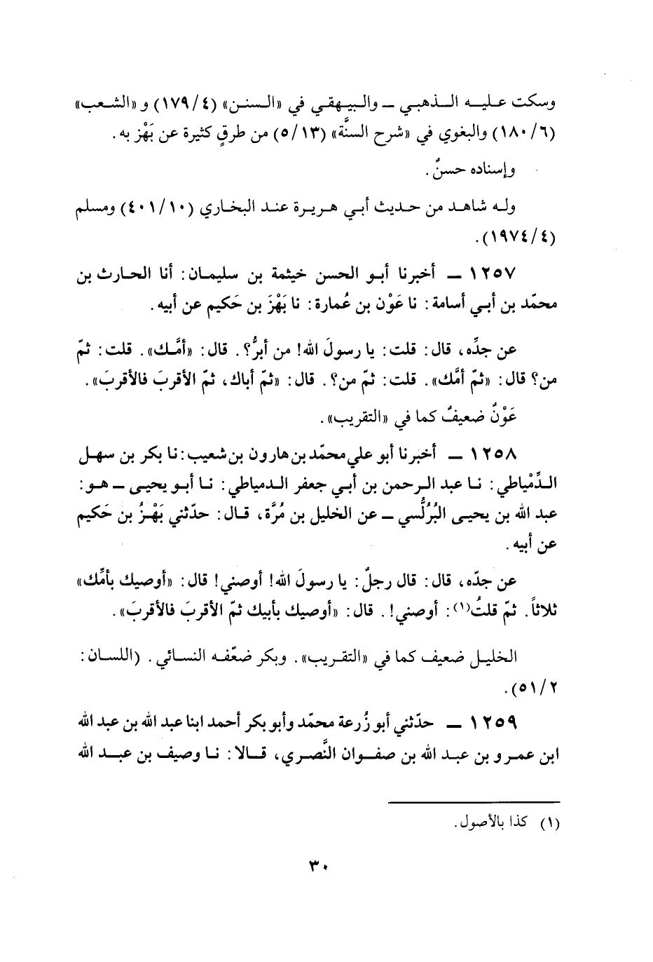 1258 - أخبرنا أبو علي محمّد بن هارون بن شعيب: نا بكر بن سهل الدِّمْياطي: نا عبد الرحمن بن أبي جعفر الدمياطي: نا أبو يحيى -هو: عبد الله بن يحيى البُرُلُّسي- عن الخليل بن مُرَّة، قال: حدّثني بَهْزُ بن حَكيم عن أبيه.