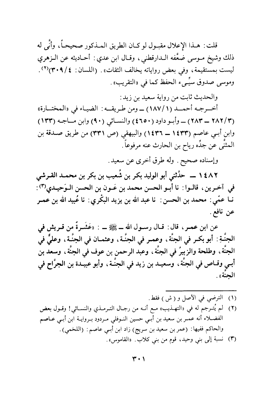 (¬2) لم يُترجم له في "التهذيب" مع أنه من رجال الترمذي والنسائي! وقول بعض الفضلاء أنه عمر بن سعيد بن أبي حسين النوفلي مردود برواية ابن أبي عاصم والحاكم ففيها: (عمر بن سعيد بن سريج) زاد ابن أبي عاصم: (اللخمي).