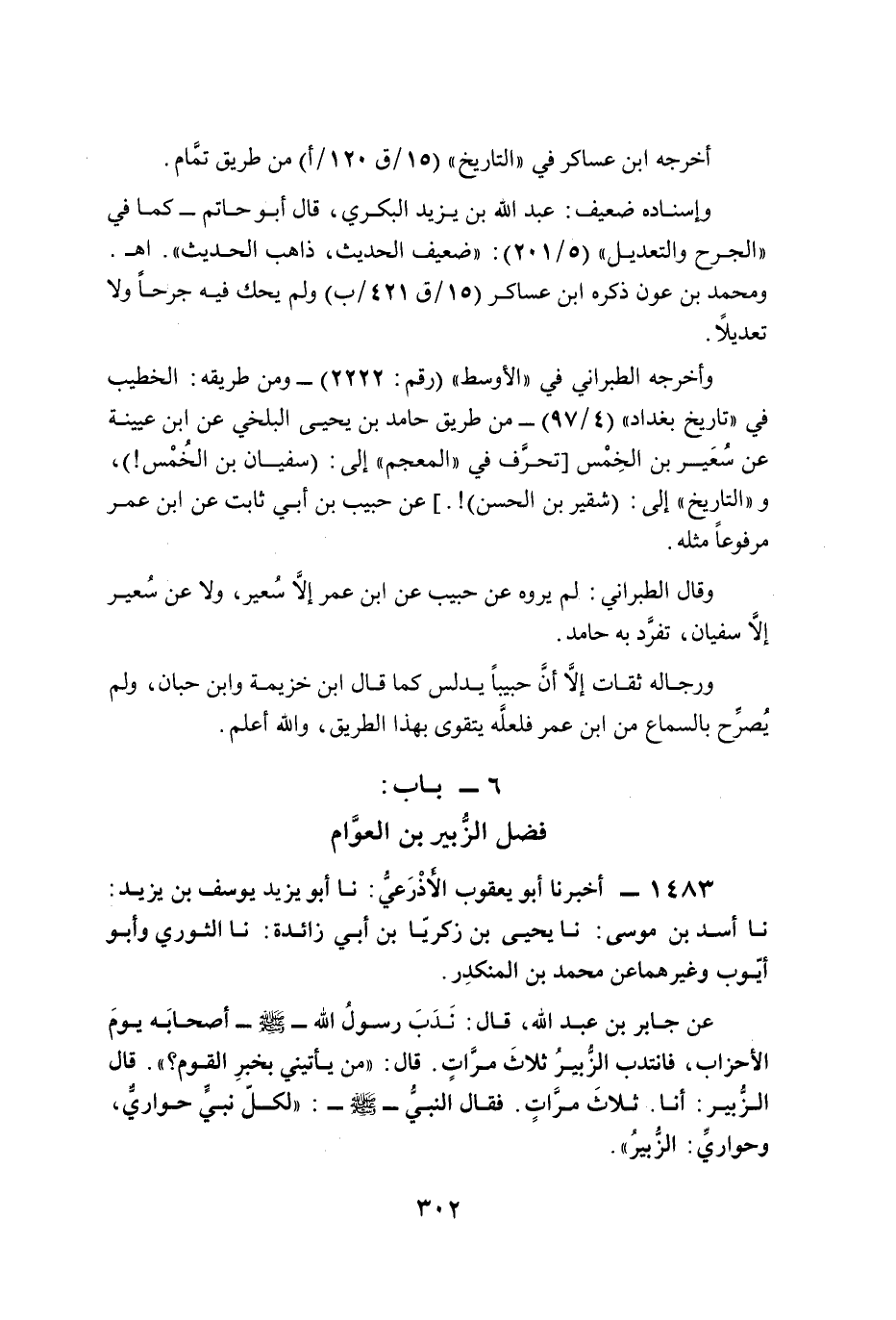 عن جابر بن عبد الله، قال: نَدَبَ رسولُ الله - صلى الله عليه وسلم - أصحابَه يومَ الأحزاب، فانتدب الزُّبيرُ ثلاثَ مرَّاتٍ. قال: "من يأتيني بخبرِ القوم؟ ". قال الزُّبير: أنا. ثلاثَ مرَّاتٍ. فقال النبيّ - صلى الله عليه وسلم - "لكلّ نبيٍّ حواريٌّ، وحواريِّ: الزُّبيرُ".