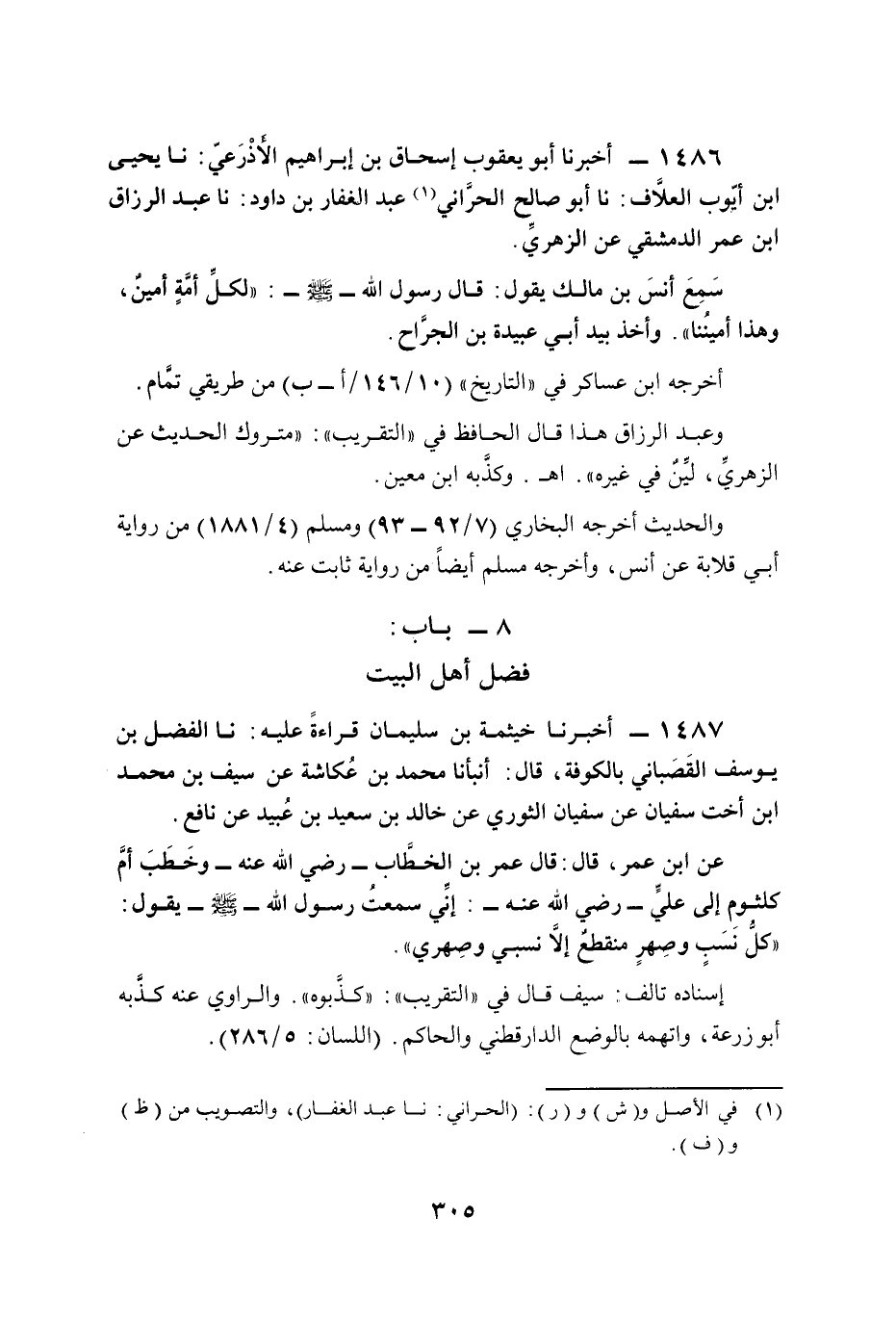 1487 - أخبرنا خيثمة بن سليمان قراءةً عليه: نا الفضل بن يوسف القَصَباني بالكوفة، قال: أنبأنا محمَّد بن عُكاشة عن سيف بن محمَّد ابن أخت سفيان عن سفيان الثوري عن خالد بن سعيد بن عُبيد عن نافع.