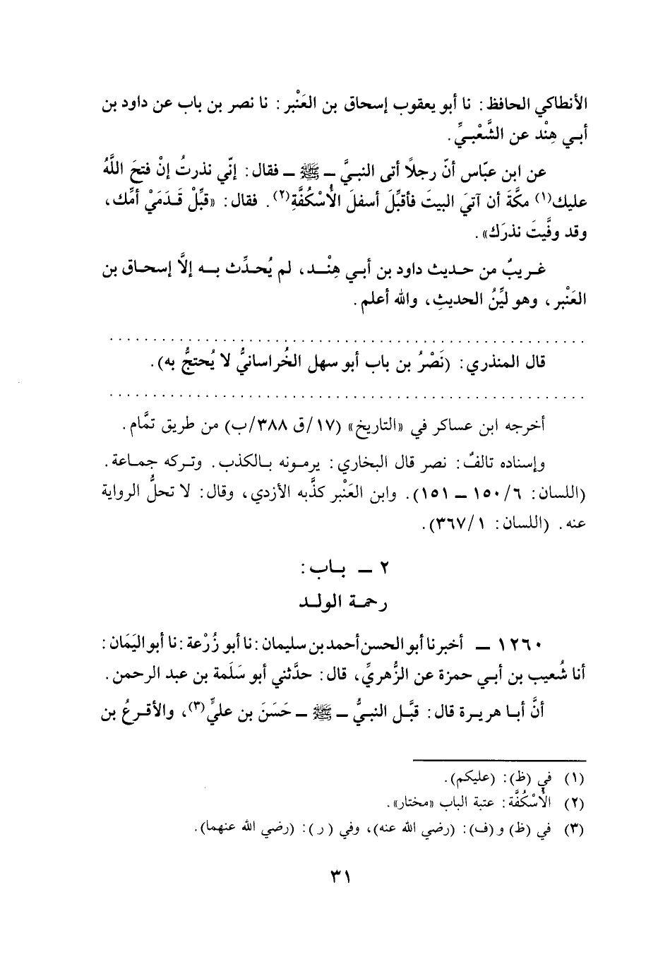 الأنطاكي الحافظ: نا أبو يعقوب إسحاق بن العَنْبر: نا نصر بن باب عن داود بن أبي هِنْد عن الشَّعْبيِّ.