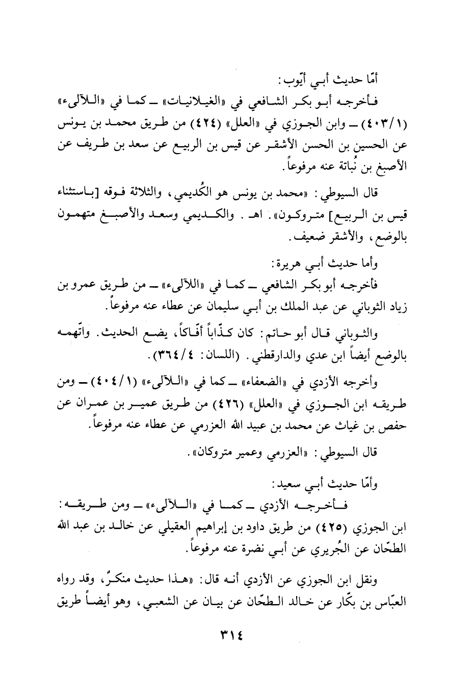 قال السيوطي: "محمَّد بن يونس هو الكُديمي، والثلاثة فوقه [باستثناء قيس بن الربيع] متروكون". أهـ. والكديمي وسعد والأصبغ متهمون بالوضع، والأشقر ضعيف.