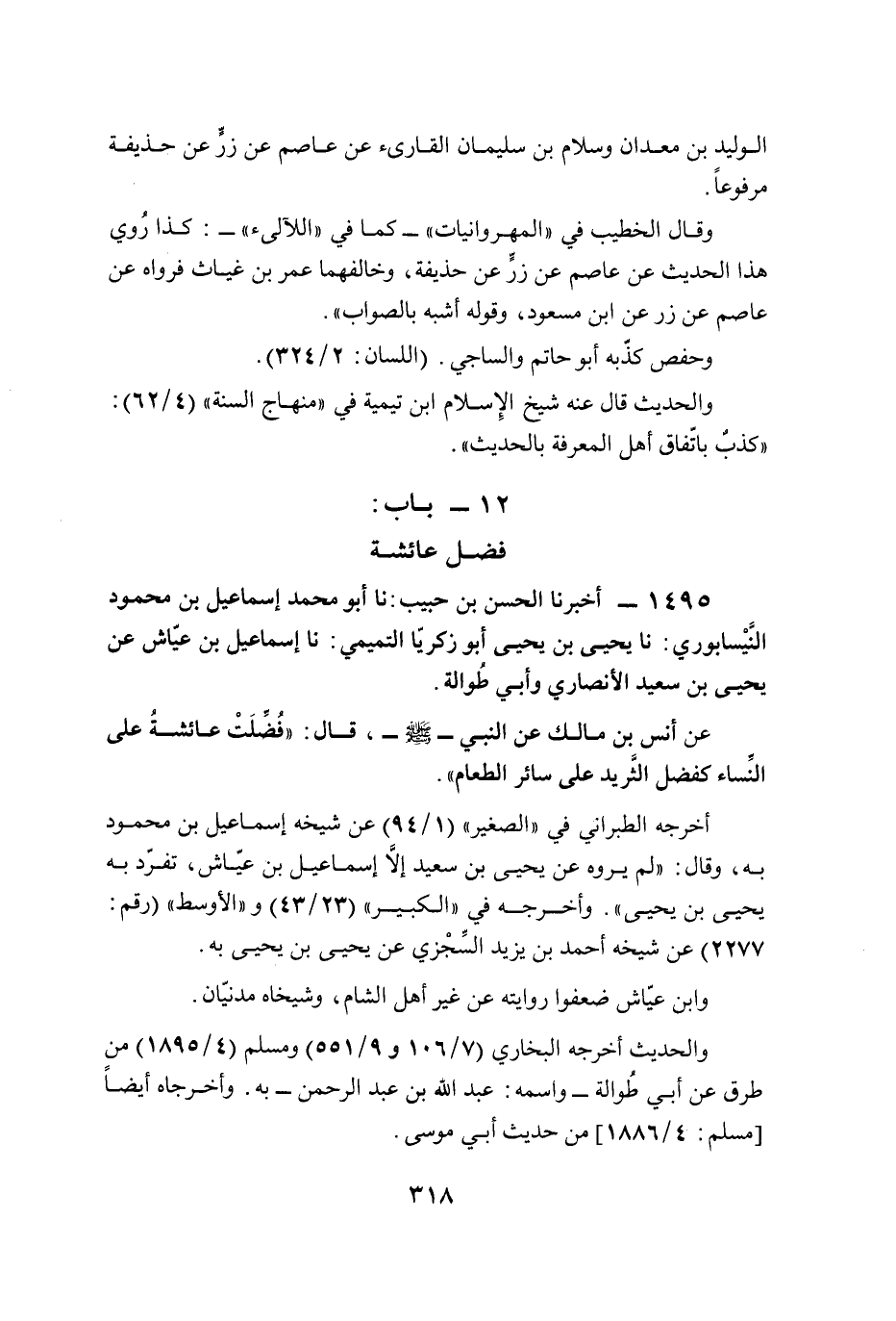 عن أنس بن مالك عن النبي - صلى الله عليه وسلم -، قال: "فُضَّلَتْ عائشةُ على النِّساء كفضل الثَّريد على سائر الطعام".