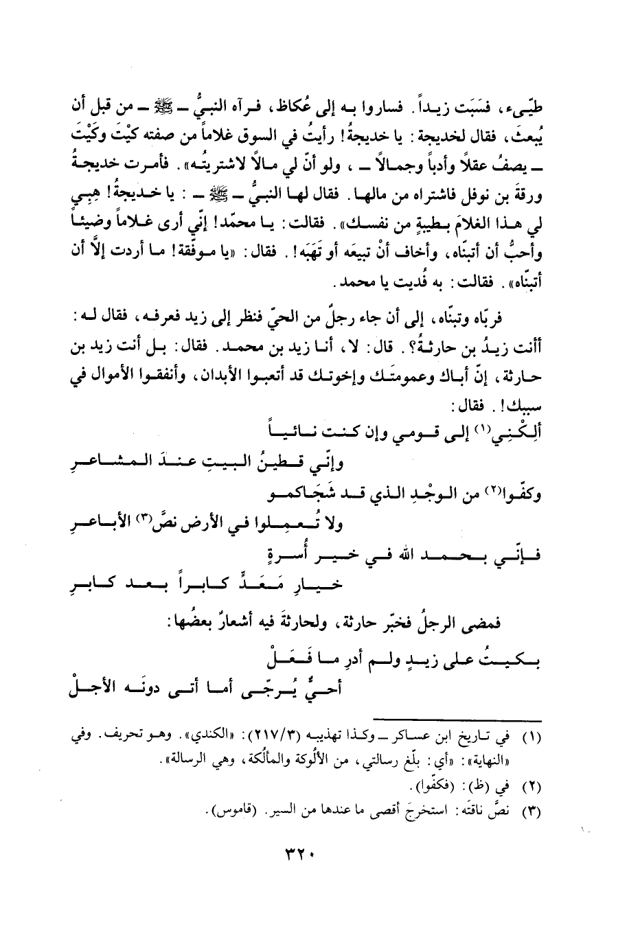 طيّىء، فسَبَت زيدًا. فساروا به إلى عُكاظ، فرآه النبيُّ - صلى الله عليه وسلم - من قبل أن يُبعثَ، فقال لخديجة: يا خديجةُ! رأيتُ في السوق غلامًا من صفته كيْتَ وكيْتَ -يصفُ عقلًا وأدبًا وجمالًا-، ولو أنّ لي مالًا لاشتريتُه". فأمرت خديجةُ ورقةَ بن نوفل فاشتراه من مالها. فقال لها النبي - صلى الله عليه وسلم -: يا خديجةُ! هِبِي لي هذا الغلامَ بطيبةٍ من نفسك". فقالت: يا محمّد! إنّي أرى غلامًا وضيئًا وأحبُّ أن أتبنّاه، وأخاف أنْ تبيعَه أو تَهَبَه!. فقال: "يا موفّقة! ما أردت إلَّا أن أتبنّاه". فقالت: به فُديت يا محمَّد.