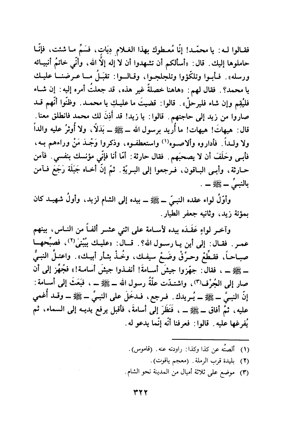 فقالوا له: يا محمّد! إنّا مُعطوك بهذا الغلام دِيَاتٍ، فسَمِّ ما شئت، فإنّا حاملوها إليك. قال: "أسألكم أن تشهدوا أن لا إله إلَّا الله، وأنّي خاتمُ أنبيائه ورسله". فأبوا وتلكّؤوا وتلجلجوا، وقالوا: تقبَلُ ما عرضنا عليك يا محمَّد؟. فقال لهم: "ها هنا خصلةٌ غير هذه، قد جعلتُ أمره إليه: إن شاء فليُقِم وإن شاء فليرحل". قالوا: قضيتَ ما عليكِ يا محمَّد. وظنّوا أنّهم قد صاروا من زيد إلى حاجتهم. قالوا: يا زيد! قد أَذِنَ لك محمَّد فانطلق معنا. قال: هيهاتَ! هيهات! ما أُريد برسول الله - صلى الله عليه وسلم - بَدَلًا، ولا أُوثرُ عليه والدًا ولا ولدًا. فأداروه وألاصوه (¬1) واستعطفوه، وذكروا وَجْدَ مَنْ وراءهم به، فأبى وحَلَفَ أن لا يصحبَهم. فقال حارثة: أمّا أنا فإنّي مؤنسك بنفسي. فآمن حارثة، وأبى الباقون، فرجعوا إلى البريّةِ. ثمّ إنّ أخاه جَبَلَة رَجَعَ فآمن بالنبيِّ - صلى الله عليه وسلم -.