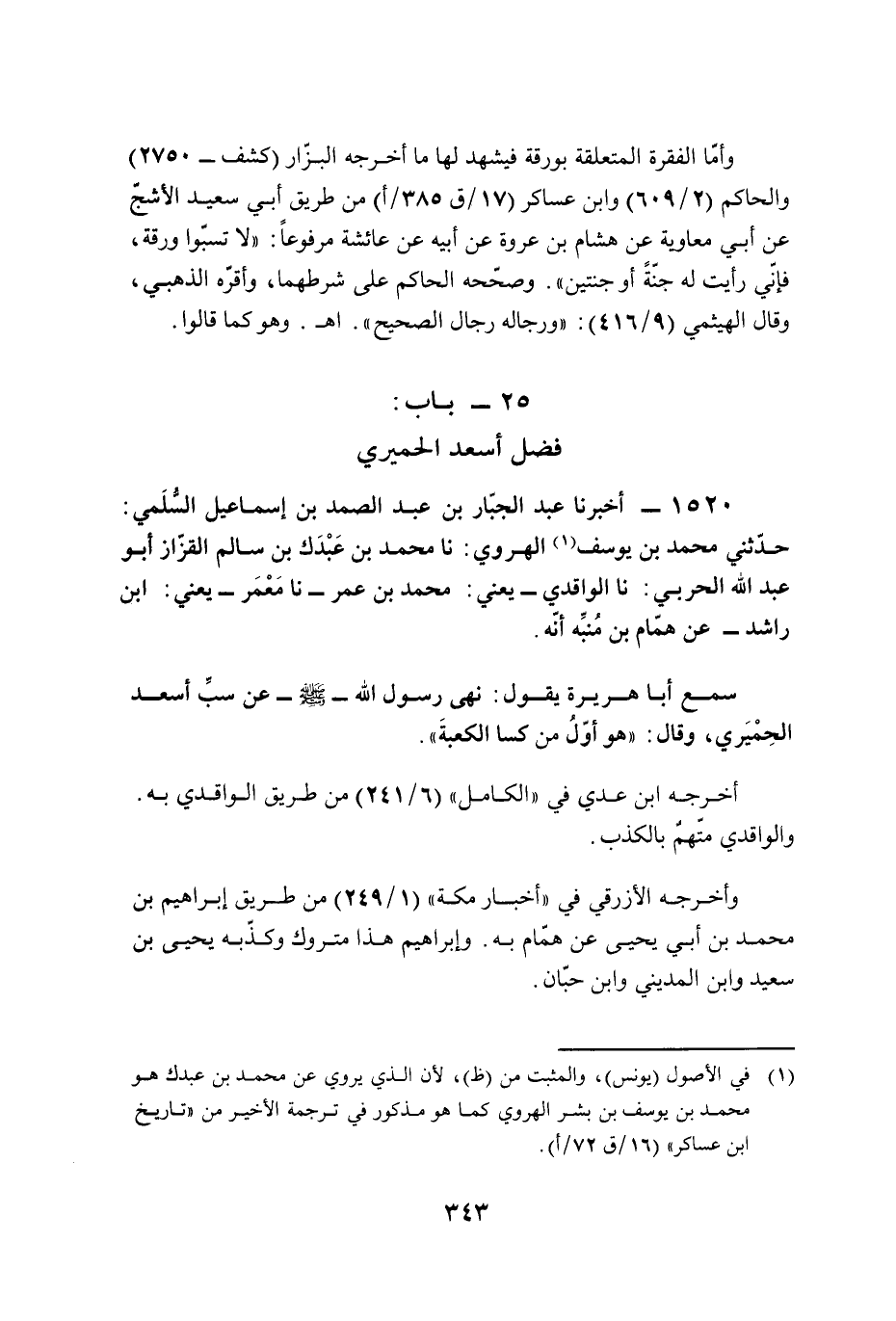 1520 - أخبرنا عبد الجبّار بن عبد الصمد بن إسماعيل السُّلَمي: حدّثني محمَّد بن يوسف (¬1) الهروي: نا محمَّد بن عَبْدَك بن سالم القزّاز أبو عبد الله الحربي: نا الواقدي -يعني: محمَّد بن عمر- نا مَعْمَر -يعني: ابن راشد- عن همّام بن مُنبِّه أنّه.