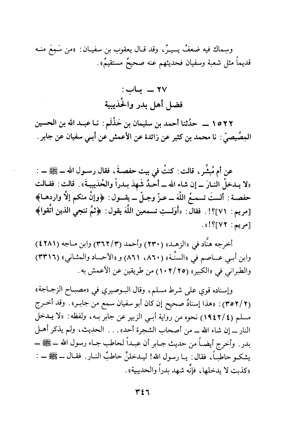 وإسناده قوي على شرط مسلم، وقال البوصيري في "مصباح الزجاجة" (2/ 352): "هذا إسنادٌ صحيح إن كان أبو سفيان سمع من جابر". وقد أخرج مسلم (4/ 1942) نحوه من رواية أبي الزبير عن جابر به، ولفظه: "لا يدخل النار -إن شاء الله- من أصحاب الشجرة أحد" ... الحديث، ولم يذكر أهل بدر. وأخرج أيضًا من حديث جابر أن عبدًا لحاطب جاء رسول الله - صلى الله عليه وسلم - يشكو حاطبًا، فقال: يا رسول الله! ليدخلنَّ حاطبٌ النار. فقال - صلى الله عليه وسلم -: "كذبت لا يدخلها، فإنَّه شهد بدرًا والحديبية".