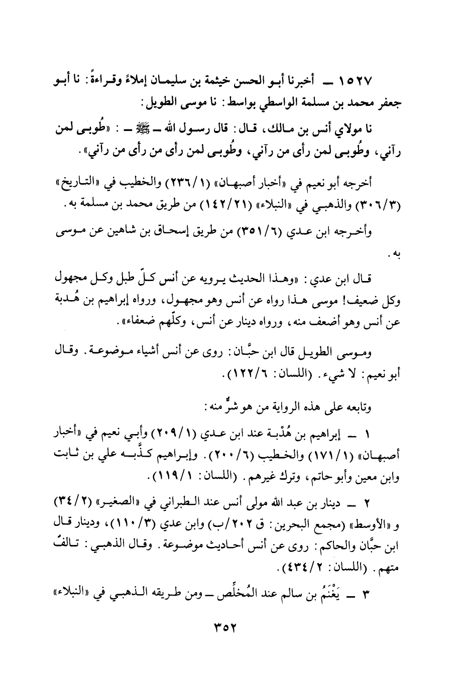 وموسى الطويل قال ابن حبَّان: روى عن أنس أشياء موضوعة. وقال أبو نعيم: لا شيء. (اللسان: 6/ 122).